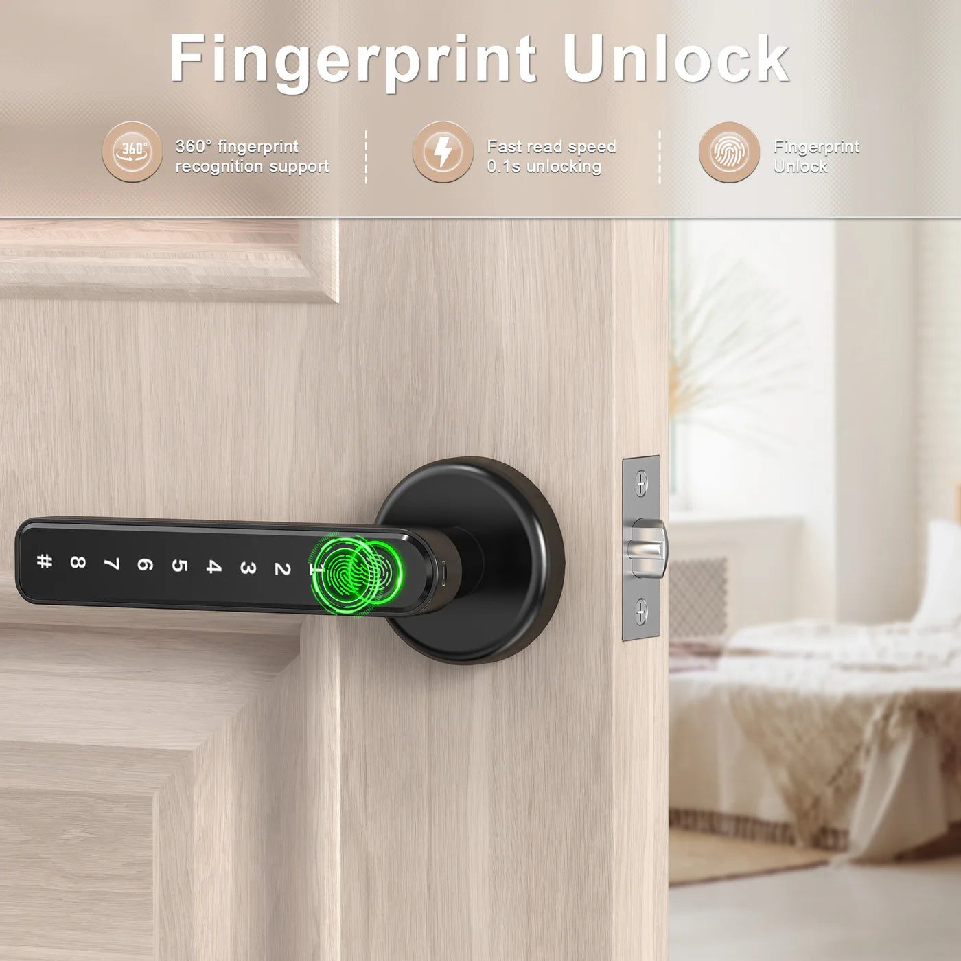 - MULTIPLE WAYS TO UNLOCK: Advanced 3-in-1 Keyless Biometric door lock: Fingerprint + Anti-peep virtual password + Physical Key, fingerprint recognition rate up to 98% and open the door just need 1 second, you can add 50 groups fingerprints, Eliminate the trouble of forgetting to bring the key when you go out.